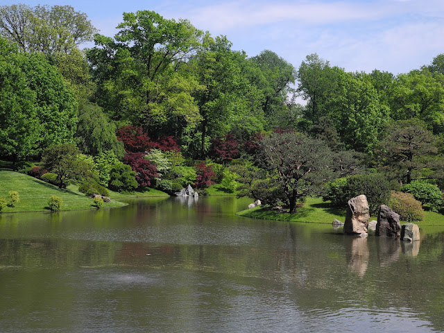 The drive to St. Louis was pretty wet; it rained the whole way and hard at times. The traffic going into St. Louis was terrible as usual just crawling along the last few miles to cross the Mississippi via the bottleneck bridge. By the time we arrived at the Missouri Botanical Garden it was nearly 1 pm, so we grabbed a bite to eat, and by then the rain had stopped. So just as the Phactor tells his students; it never rains on a field trip, although it can storm. A bridezilla was showing her true stripes (do you know what you're getting, fellow?) because the garden had the temerity to let a deluge turn her wedding site into a soggy mess. Heels and chair legs would have sunk in immediately, and the area would not have been kind to the hem of that white dress either. Here's a nice view across the garden's pond, and remember, it's still just mid-April. The NRA was in town, but didn't see any of them taking in the garden. Funniest thing we saw was this morning while returning from a coffee safari; a butler/doorman (?) in a tux and white tie, trying to maintain his dignity while walking a toy poodle at 8 am. Who wears a tux at 8 am on a Sunday for dog walking? Did he have his little plastic baggy? A penguin and a dog are out for a walk,....![]()